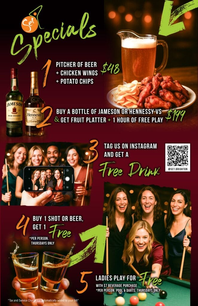 Enjoy limited-time offers at Set Lounge Brighton Beach. From discounted drinks to party packages, our specials are designed to keep the fun going without breaking the bank.
